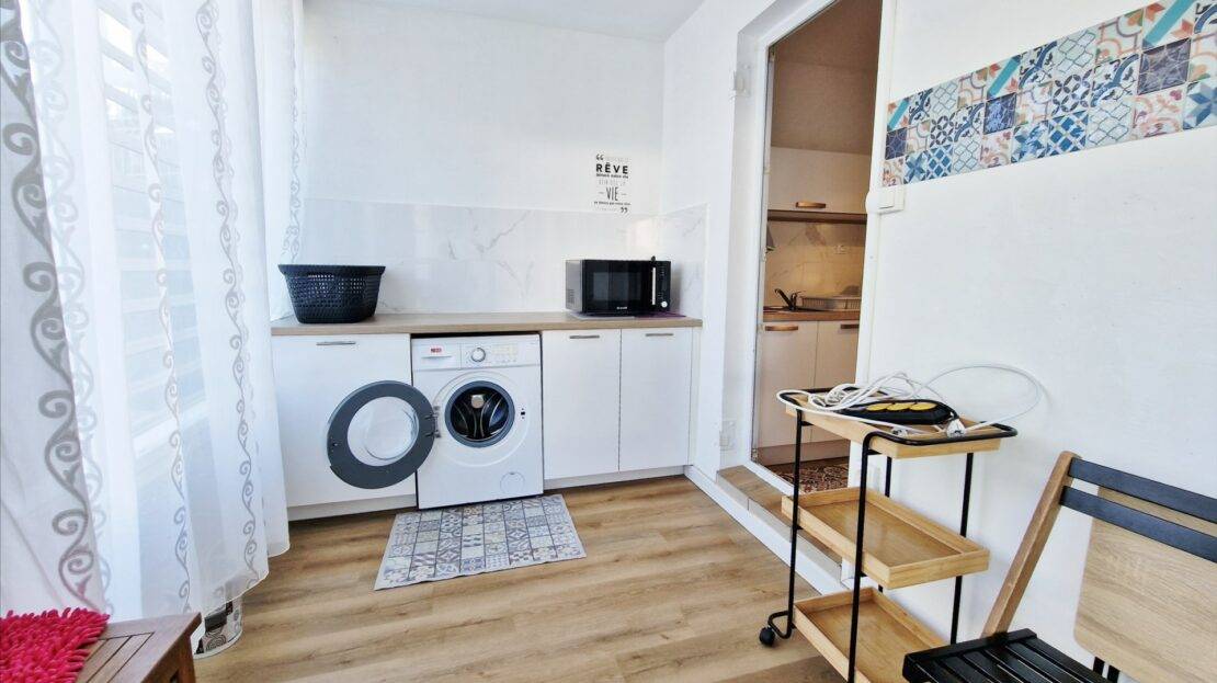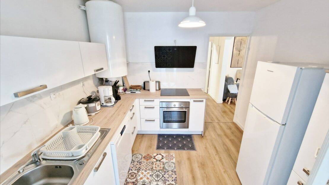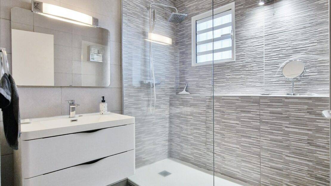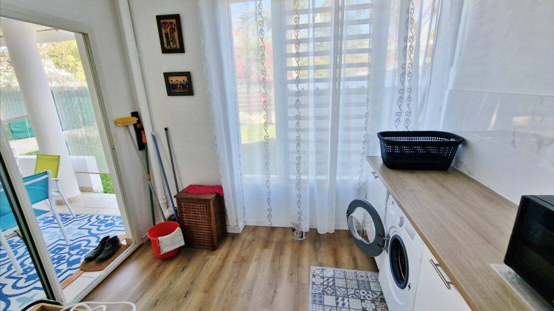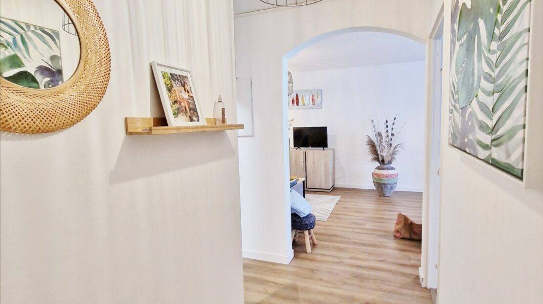 Il dispose, d’une éntrée, d’un beau séjour bien lumineux, une cuisine équipée, une buanderie, une varangue ferméee, 2 chambres, une salle de bains récente avec une douche à l’italienne, un wc et une terrasse d’environ 11m².