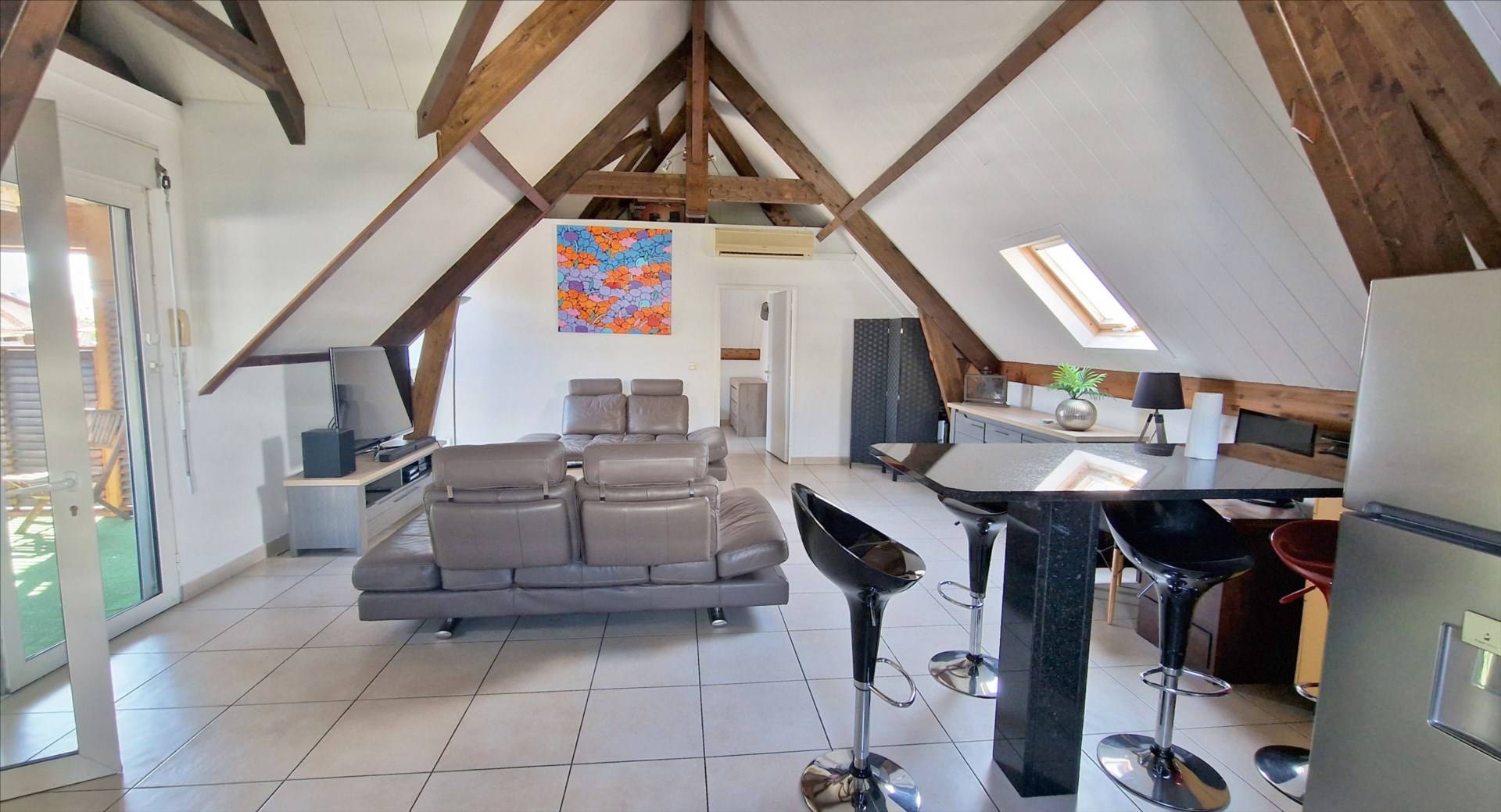 Entrée, séjour lumineux avec belle hauteur sous plafond, cuisine toute équipée, une chambre avec climatisation et placards, une salle de bains avec wc.
