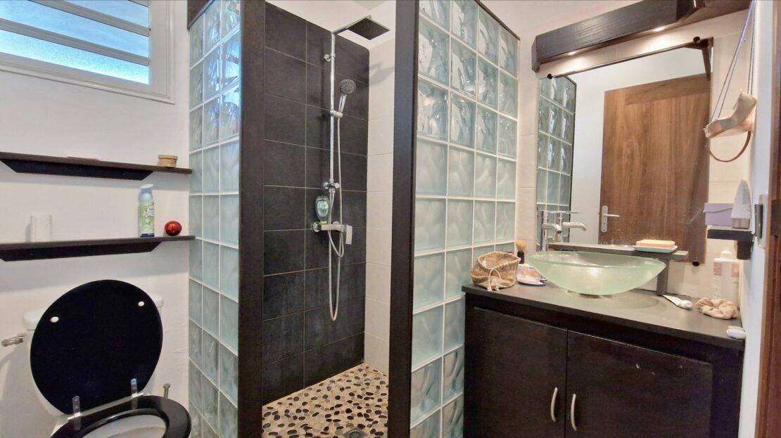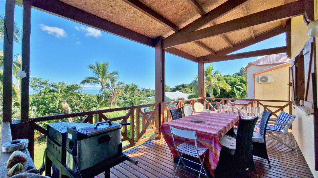 Vous trouverez 3 chambres climatisées dont une avec accès à l’extérieur et une suite parentale. Un spacieux séjour / salle à manger avec cuisine ouverte équipée, donnant sur une belle varangue de 17m² avec vue mer.