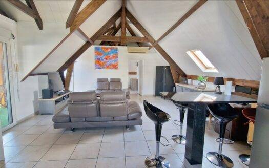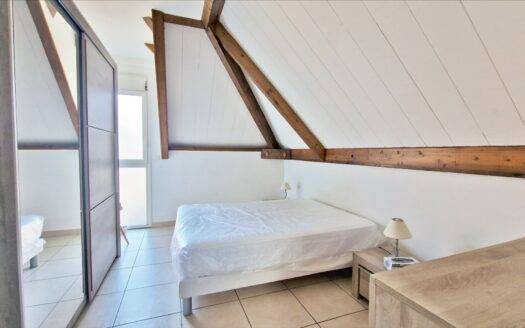 Entrée, séjour lumineux de 21m², cuisine ouverte entièrement équipée, une chambre avec climatisation et placards, une salle de bains avec douche à l’italienne.